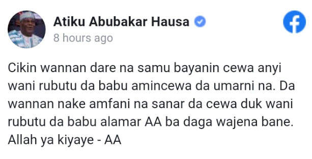 On Facebook, the former Vice President in a message on his verified Hausa page distanced himself from the message. He also stated that any message on social media that did not come with the initials “A. A.” were not his.