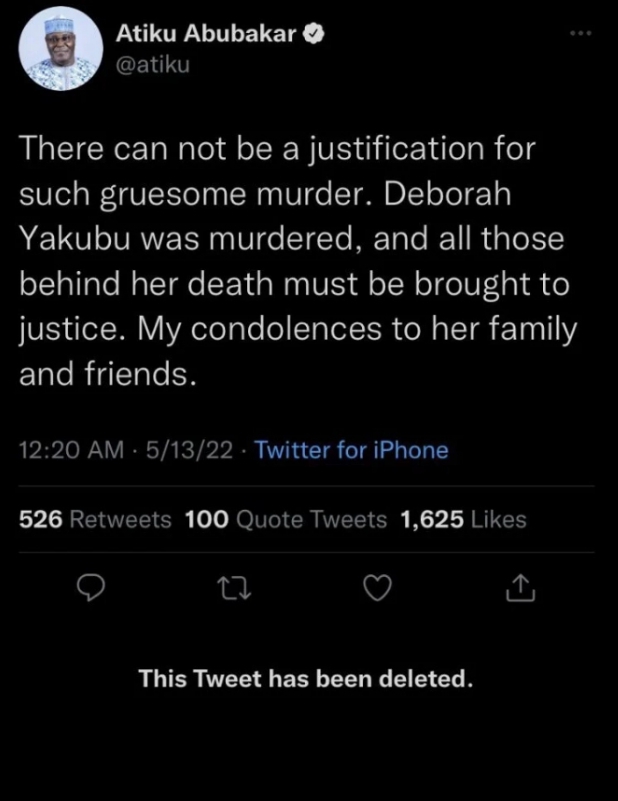 Presidential hopeful, Atiku Abubakar, has distanced himself from a tweet condemning the lynching of Deborah Samuel, a Christian 200-level student of Shehu Shagari College of Education Sokoto, who was killed for allegedly blaspheming Prophet Muhammad.