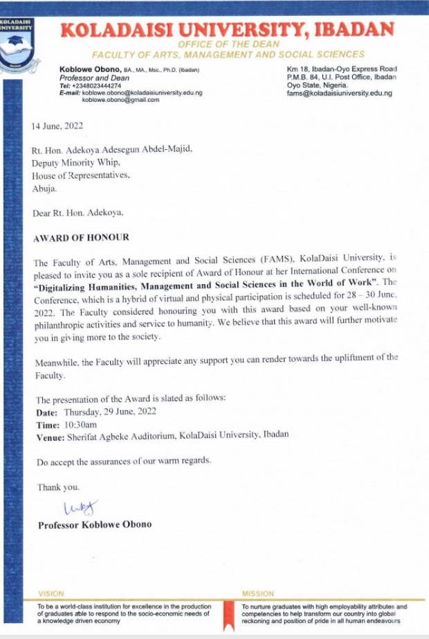 The letter reads, “The Faculty of Arts, Management and Social sciences (FAMS), Koladaisi University, is pleased to invite you as a sole recipient of Award of Honour at her International Conference on “Digitalizing Humanities, Management and Social Sciences in the World of Work”.
