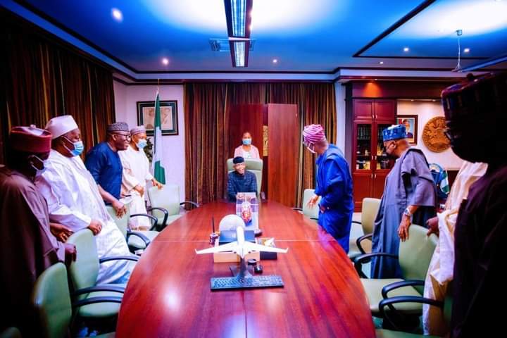 The vice-president, Prof. Yemi Osinbajo on Tuesday, received governors of the ruling All Progressives Congress who came on a felicitation visit in his office at the presidential villa as he recovers from surgery.
