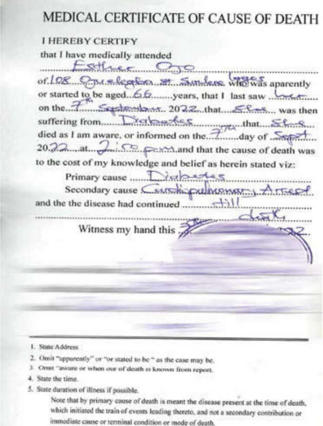 With the payment of N10, 000, sixty-six year-old Esther Ojo (purportedly a living person) who is diabetic and hypertensive, was declared dead. The irony of it was that Ojo’s body was not seen by the doctor whose signature and name was scribbled at the bottom of a death certificate which our correspondent went undercover to procure.