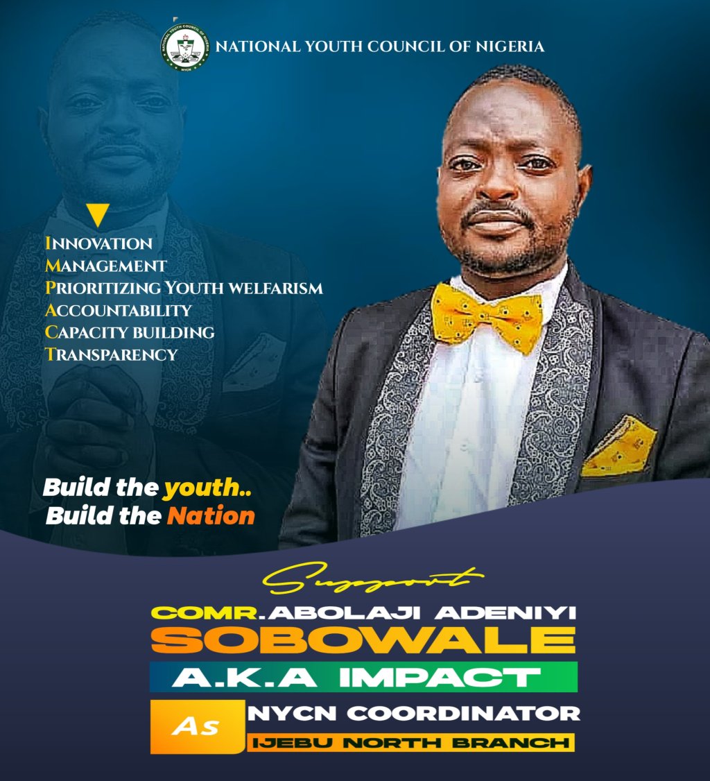 An aspirant for the post of Coordinator in the forthcoming congress of the National Youth Council of Nigeria (NYCN) in Ijebu North local government, Comr. Sobowale Abolaji Adeniyi (Impact) has reeled out his manifesto wherein he vowed to create a sustainable pathway for policies of encompassing opportunities in the dynamic world of self-condense of growth and development which will break frontiers in all spheres of human endeavour.