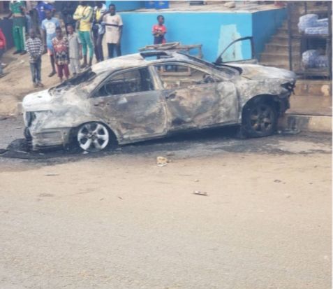 In the chaos that followed, the driver of the Toyota vehicle fled the scene to avoid arrest. In response, a group of irate youths set the abandoned vehicle on fire before law enforcement and other emergency response teams arrived at the scene.