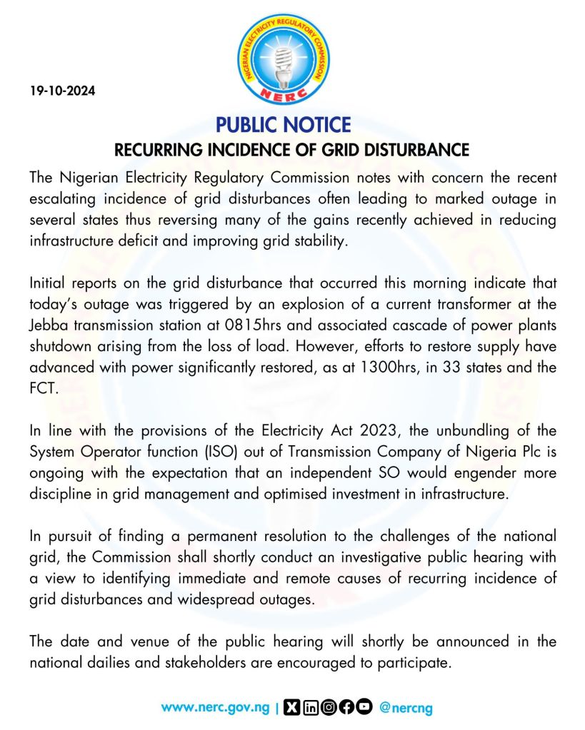 The statement read in part: “The commission notes with concern the recent escalating incidence of grid disturbances often leading to marked outage in several states thus reversing many of the gains recently achieved in reducing infrastructure deficit and improving grid stability