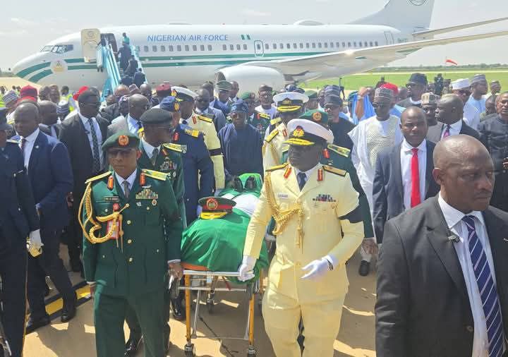 Buhari’s remains, which arrived earlier in the day from London—where he died on Sunday, July 13, 2025, at the age of 82 following a prolonged illness—were flown to Katsina aboard a Nigerian Air Force aircraft. Vice President Kashim Shettima and other senior government officials accompanied the body, which was received at the Umaru Musa Yar’Adua International Airport by President Bola Tinubu and top military and civilian leaders.