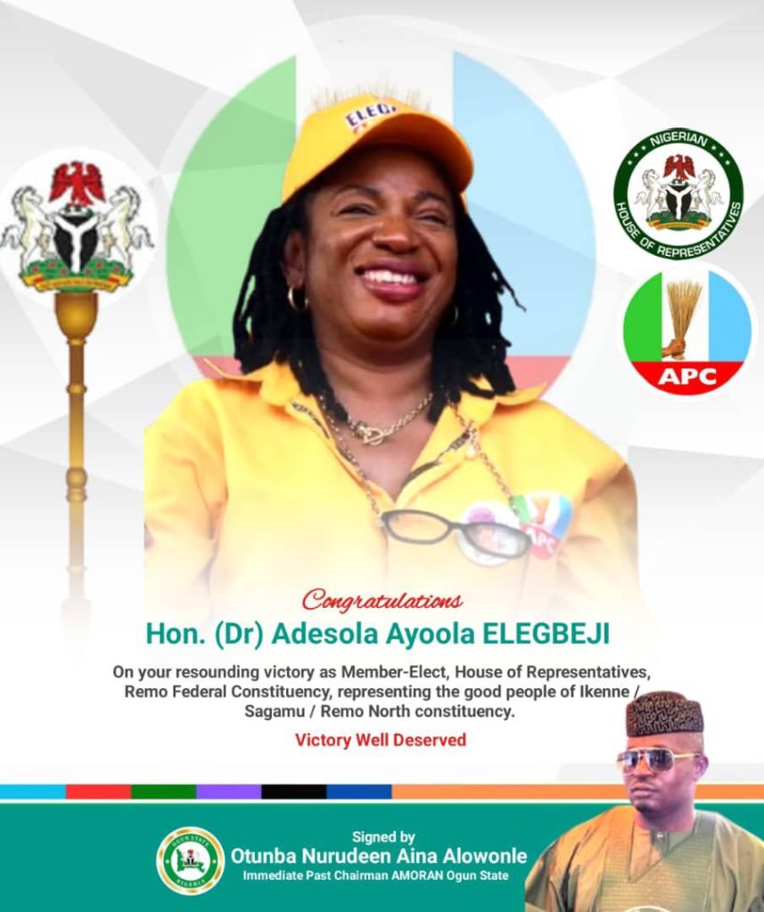 While congratulating the House of Representatives Member-elect, Hon. (Dr.) Princess Adesola Ayoola Elegbeji, Otunba Alowonle charged her to justify the trust and confidence reposed in her by delivering purposeful and people-oriented representation that will enhance the welfare and progress of Remo Federal Constituency.