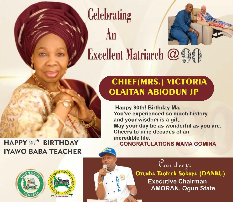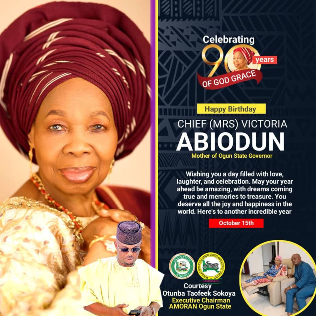 The Chairman of the Ogun State chapter of the Articulate Motorcycle Owners and Riders Association of Nigeria (AMORAN), Otunba Taofeek Sokoya, has joined countless well-wishers across the nation in celebrating Chief (Mrs.) Victoria Olaitan Abiodun, the cherished mother of the Governor of Ogun State, His Excellency Prince Dapo Abiodun, CON, as she gracefully marks her 90th birthday.