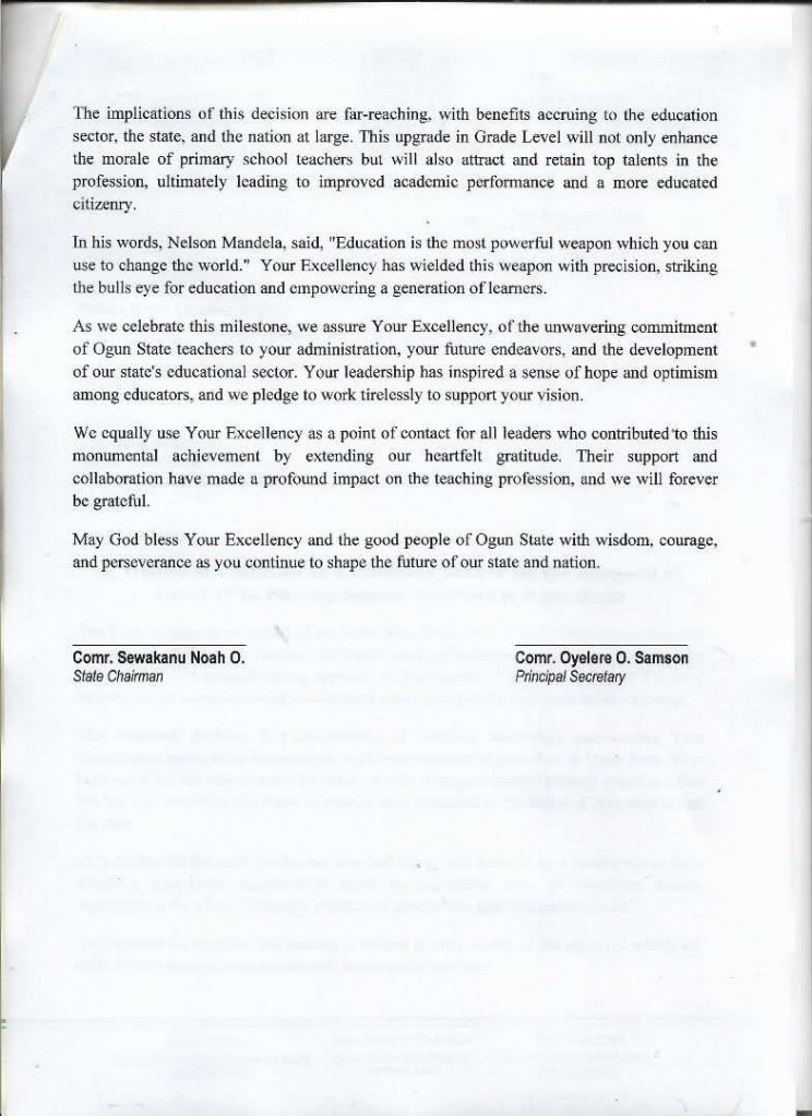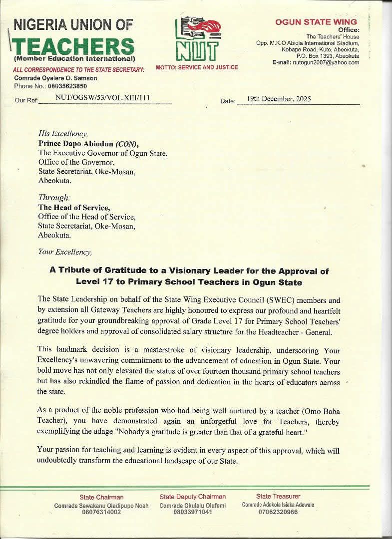 The Nigeria Union of Teachers (NUT), Ogun State Wing, has applauded Governor Dapo Abiodun for approving Grade Level 17 for degree-holding primary school teachers and the consolidated salary structure for Head Teachers-General in the state, describing the decision as “a historic milestone and a masterstroke of visionary leadership.”