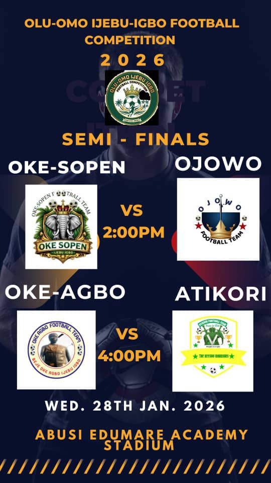 According to the fixtures released by the organisers, Oke Sopen will square off against Ojowo in the first semi-final by 2:00 p.m., while Oke Agbo will take on Atikori in the second clash scheduled for 4:00 p.m. Both matches will be played on Wednesday, January 28, 2026, at the Abusi Edumare Academy Stadium.
